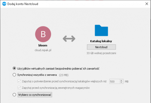 „Użyj plików wirtualnych zamiast bezpośrednio pobierać ich zawartość” - synchronizowana będzie tylko hierarchia plików i katalogów. Plik będzie pobierany na komputer dopiero w momencie otwierania. Ustawienie to pozwala maksymalnie oszczędzać miejsce na dysku twardym zajmowane przez pliki z Nextcloud.